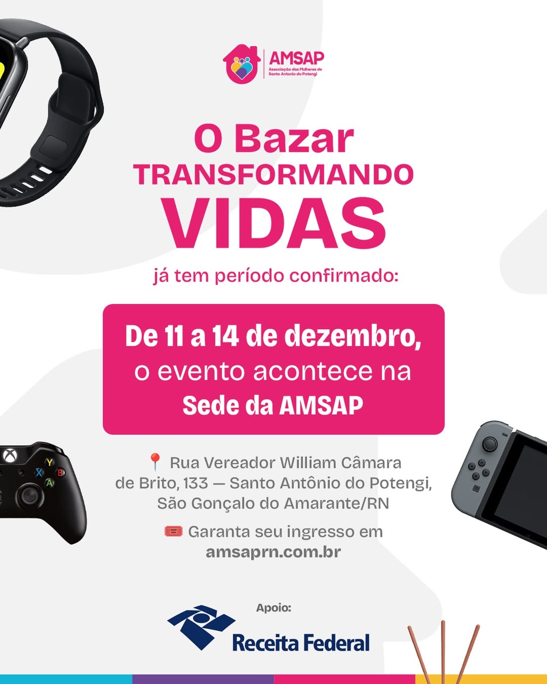 A Associação das Mulheres de Santo Antônio do Potengi (AMSAP) realizará entre 11 e 14 de dezembro o bazar “Transformando Vidas”, iniciativa que contará com o apoio da Receita Federal do Brasil e comercializará produtos com preços muito abaixo dos praticados no mercado. A ação acontecerá na sede da instituição, localizada na Rua Vereador Wiliam Câmara de Brito, 133, em Santo Antônio do Potengi, São Gonçalo do Amarante, considerando ainda que todas as normas de participação deverão ser seguidas pelos visitantes.