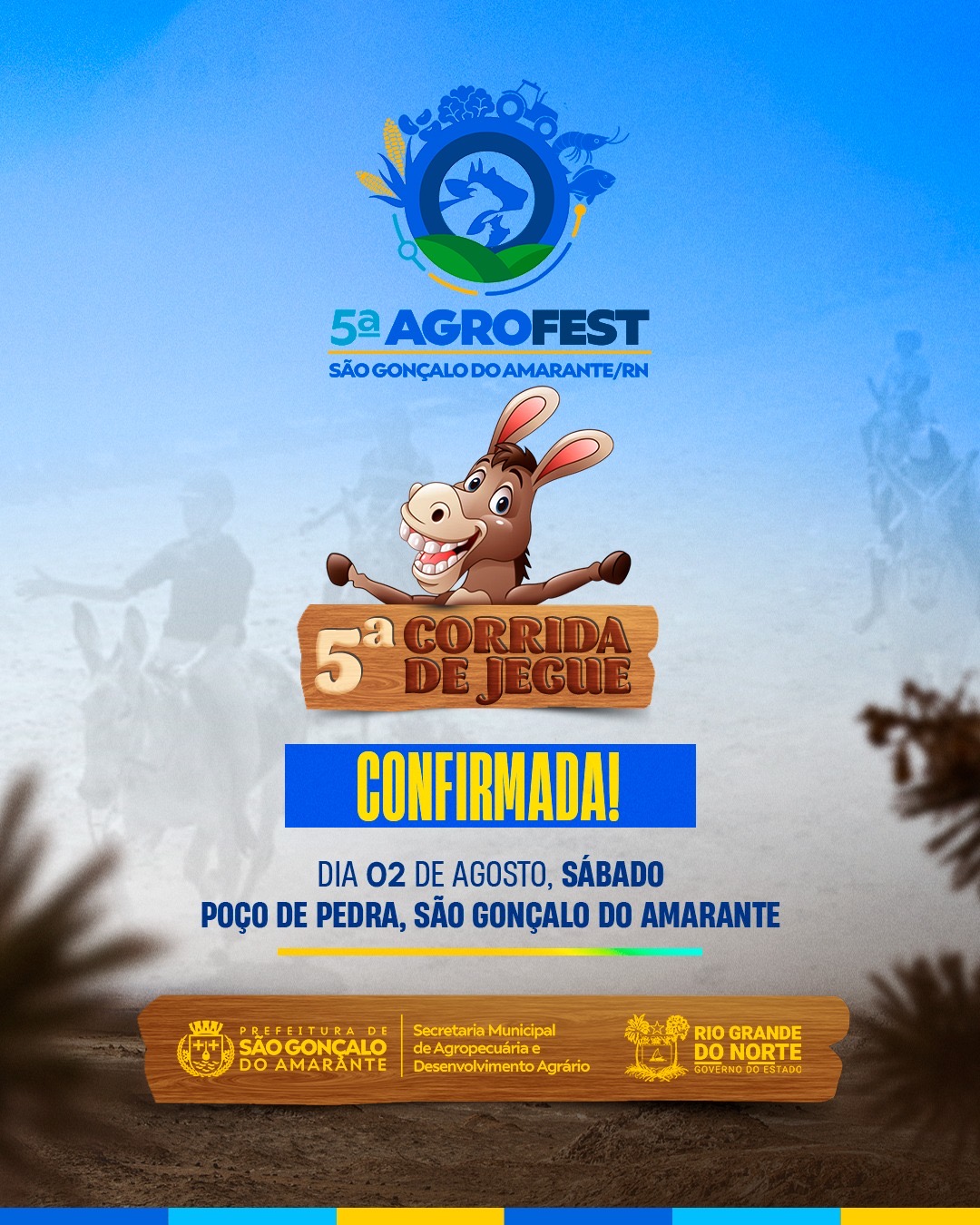 A Prefeitura de São Gonçalo do Amarante, por meio da Secretaria Municipal de Juventude, Esporte e Lazer, confirma oficialmente a realização da tradicional Corrida de Jegue, dentro da programação da 5ª edição da Agrofest.