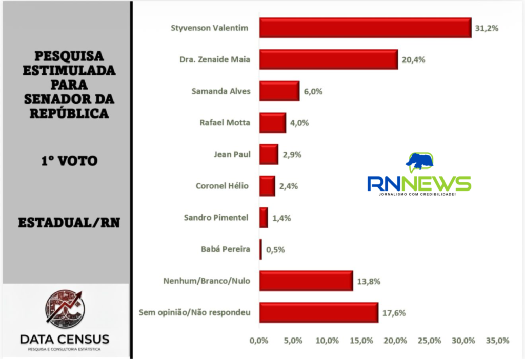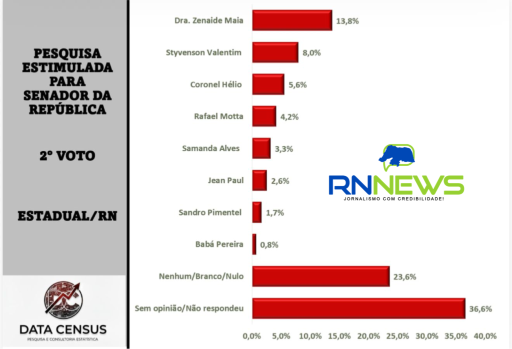 A pesquisa do RN News, em parceria com a Data Census, mostra como está a disputa para o Senado Federal considerando o 1º + 2º voto consolidado. O senador Styvenson lidera com 36,1%, seguido pela senadora Zenaide Maia, com 31,5%. Em seguida aparecem Samanda Alves, com 8,5%; Rafael Motta, com 7,6%; Coronel Hélio, com 7,4%; Jean Paul, com 5,1%; Sandro Pimentel, com 2,8%; e Babá Pereira, com 1,1%.