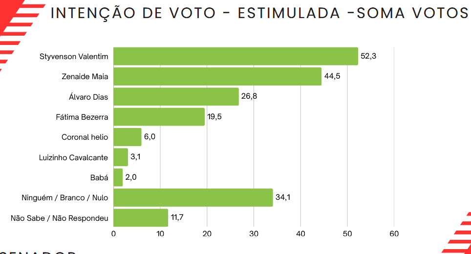 A somatória do primeiro e segundo voto para o Senado em Touros mostra a liderança de Styvenson Valentim com 52,3% e Zenaide Maia em segundo com 44,5%.